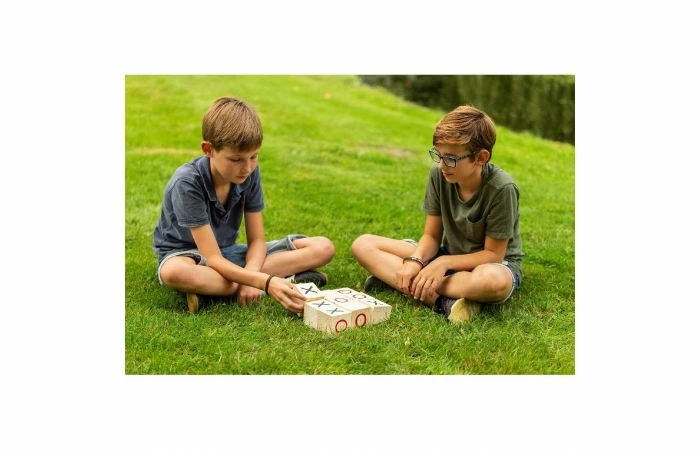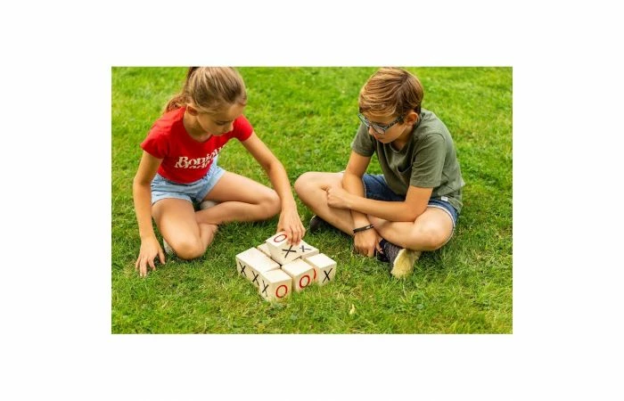 - Inhoud: 9 houten blokken met rondjes en kruisjes erop afgebeeld.