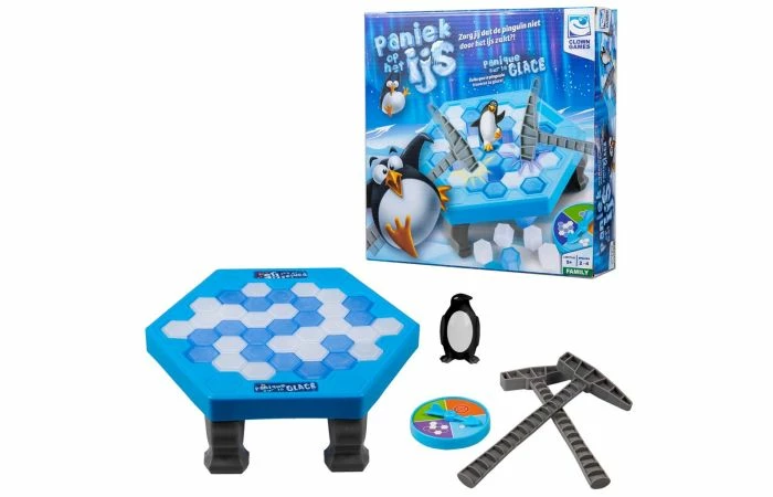 Zorg jij dat de pinguïn niet door het ijs zakt? Om de beurt mag je aan het rad draaien, en je voert steeds de opdracht uit die de pijl aanwijst. De speler, die de pinguïn van het ijs laat vallen, verliest het spel! Voor 2 tot 4 spelers vanaf 5 jaar.