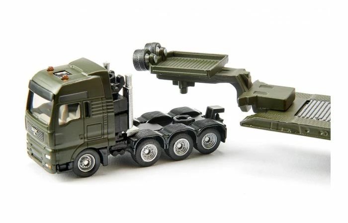 Op de dieplader van deze zwaartransporter met zwanenhalsconstructie staat de internationaal gerenommeerde Leopard-tank. Natuurlijk kan de oplegger worden afgekoppeld. Geschikt voor kinderen vanaf 5 jaar.