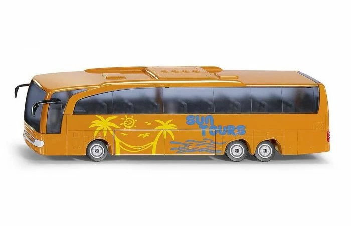 Onderweg op vakantie met de bus. Met de Mercedes Benz Travego touringcar bus van Siku neem je passagiers en baggage veilig mee op reis.
