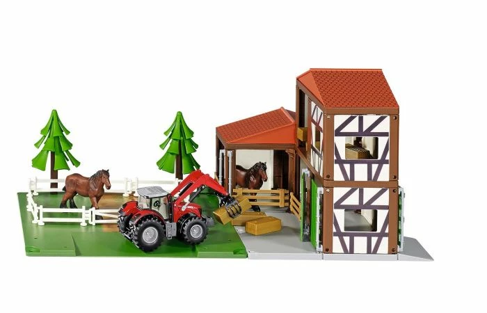 De set vormt een ideale uitbreiding op de SIKUWORLD maar zorgt ook op zichzelf als eigen speelwereld voor veel speelplezier. De SIKUWORLD paardenfarm geeft kinderen inspiratie voor een nieuwe speelwereld met dieren en een landelijk leven op de boerderij. Paarden die in de wei staan begroeten de paardenliefhebber met een hard gehinnik: de volgende rit staat voor de deur. maar er moet eerst nog een en ander op de boerderij gebeuren. Met de meegeleverde Fendt 939 tractor en de balengrijper worden de hooibalen op de hooizolder opgeslagen. De gebouwen in vakwerkstijl kunnen met behulp van het steeksysteem intuïtief en voor kinderen eenvoudig worden samengevoegd en naar eigen ideeën worden aan- en omgebouwd. Het gebouw met twee verdiepingen beschikt over een doorgang en er kan in de paardenstallen en de hooizolder worden gespeeld.