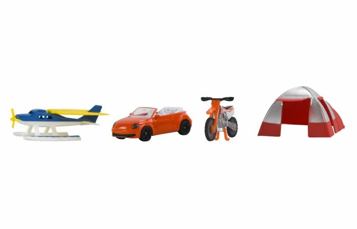 Plezier in de vrije tijd voor iedereenAan het grote meer gebeurt altijd wat. Aan de oever staat een oranje cabrio naast een grote tent met een baldakijn. Net als er een watervliegtuig landt, komt er met luid geknetter een crossmotor de hoek om. Met de siku set vrije tijd ontstaat een eigen speelwereld. De set bestaat uit een watervliegtuig met opklapbare vleugels, een KTM crossmotor op banden met terreinprofiel, een standaard en een beweegbaar stuur en een Beetle cabrio met sportvelgen en rubberen banden.