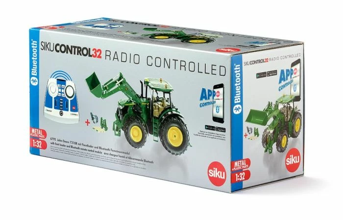App downloaden, Bluetooth-verbinding inschakelen en spelen. Met de nieuwe SIKUCONTROL app kan de John Deere 7310R met frontlader met de smartphone of met een tablet (Android en iOS) worden bestuurd. De John Deere 7310R is de sterkste vertegenwoordiger van de serie 7R. Het SIKUCONTROL-model van metaal en kunststof onderscheidt zich niet alleen door de talrijke features maar ook door de aandacht voor details die de fans weten te waarderen. Alle functies en de vijf transmissies van de tractor kunnen via de app worden bediend, naar keuze via de virtuele joystickbediening of de bewegings- en kantelsensoren van het mobiele apparaat. Deze intuïtieve feature is een welkome afwisseling en zorgt voor extra plezier bij het spelen. Met de app is nauwkeurig rangeren mogelijk en kunnen de frontlader, de aanhanger van Joskin & Fortuna of de ploeg van Vogel & Noot worden bediend en bestuurd. Net zoals bij de module voor afstandsbediening kunnen bovendien de rijverlichting op de motorkap, de werkschijnwerpers aan de cabine, de knipperlichten achter en de verlichting rondom worden ingeschakeld. De SIKUCONTROL app geeft tractorfans daarnaast nog interessante informatie over de John Deere 7310R tractor. Het is ook mogelijk om een naam voor de tractor op te slaan. De instellingen en functies van de app worden permanent bijgewerkt. Met behulp van de OTA-functie (Over-The-Air) van de app kunnen software-updates voor de tractor direct worden geïnstalleerd.