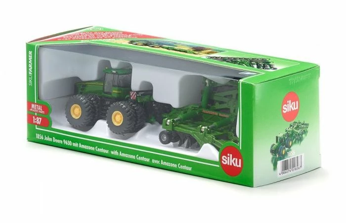 Het tot nog toe grootste tractormodel, schaal 1:87 is de kollosale John Deere kniktractor 9630. Een beresterk model dat door een knikscharnier in het midden van de machine wordt gestuurd. In combinatie met de enorme cultivator van het merk Amazone wordt de tractor met dubbele banden geleverd. Dit imposante stel mag op geen enkele speelgoedboerderij op een kleine schaal ontbreken. De modelcombinatie is voornamelijk gemaakt van metaal. De beide cultivatorelementen van de Amazone Centaur kunnen omhoog worden geklapt voor transport over de weg.