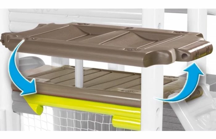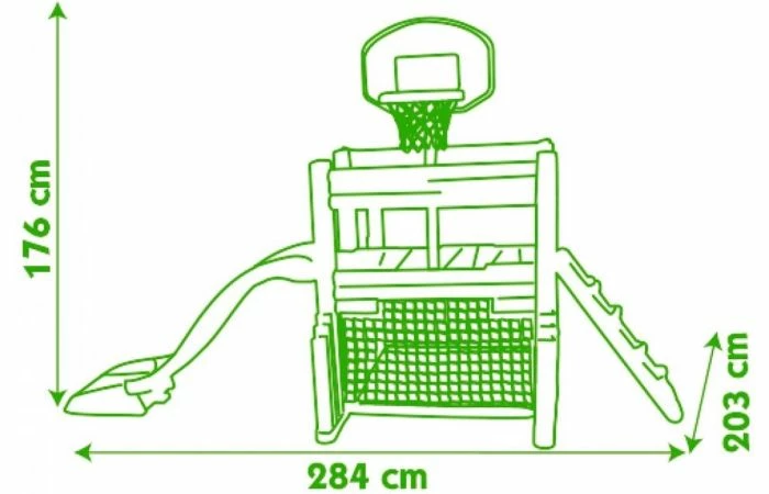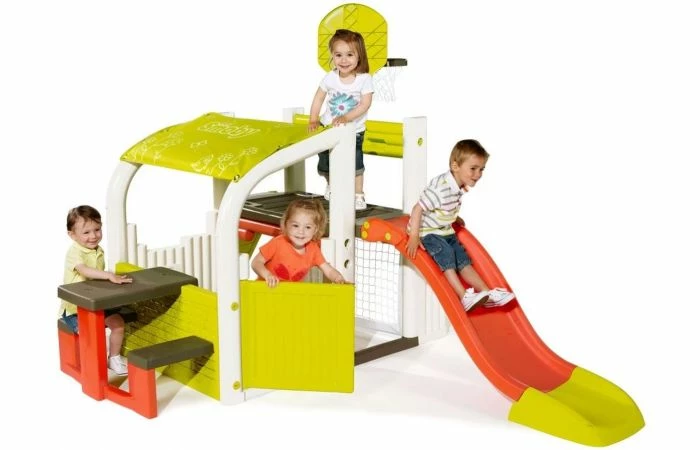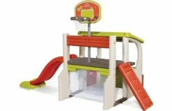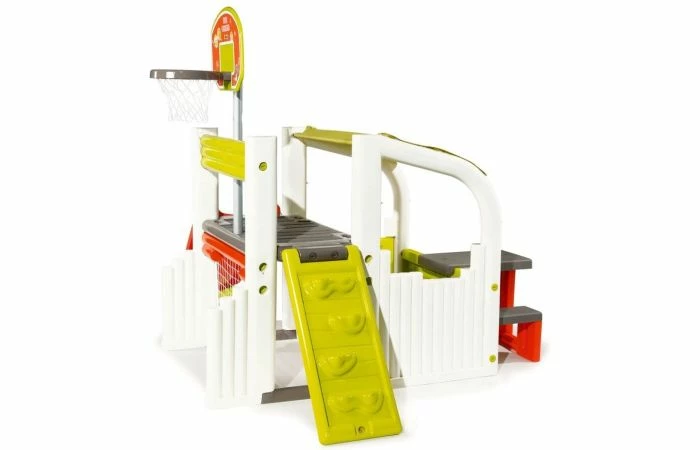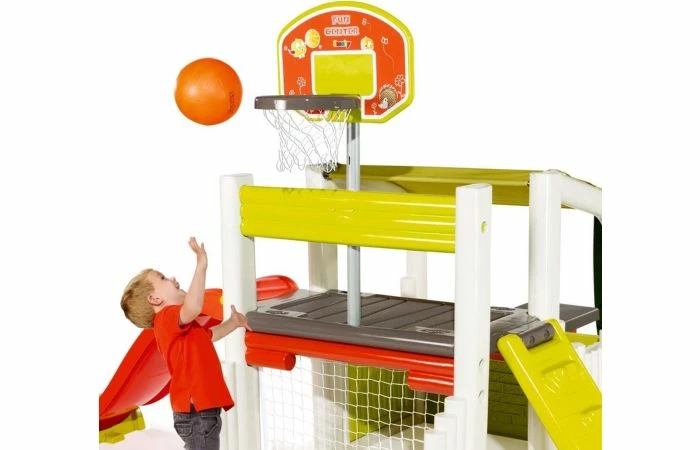 Het Smoby Fun Center speeltoestel is het meest veelzijdige speeltoestel van Smoby. Dit speelhuisje beschikt over een basketbalkorf, voetbaldoeltje, maar ook een zitgedeelte en overdekt gedeelte. Multisportactiviteitencentrum voor kinderen vanaf 2 jaar. Uitgerust met 2 ruimtes: – huisgedeelte met een dak, 1 poort en een picknickplaats met 1 tafel en 2 banken. – multisportterrein voorzien van: 1 glijbaan van 1.50m, 1 mandje basketbal, 1 voetbalkooi en 1 omkeerbare muur (ladder of klimmen). De structuur is van geblazen plastic gemaakt voor meer stevigheid en stabiliteit. De kunststof delen zijn anti-UV behandeld voor een goede weerstand en betere kleurechtheid.