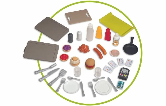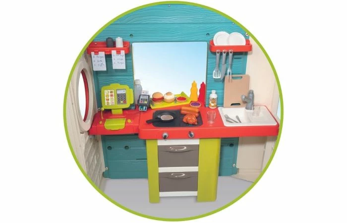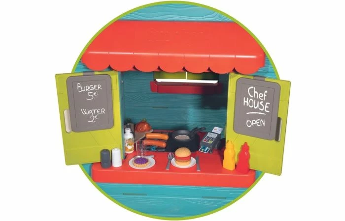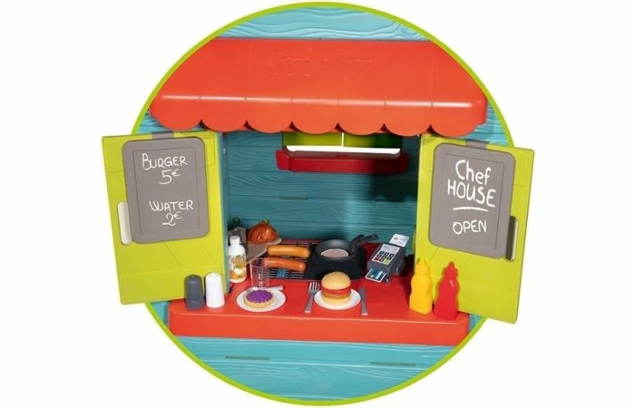 Deze hut bestaat uit een halve deur en 2 ramen met 4 luiken: aan het eind van de dag kan je kleintje de luiken sluiten! Verschillende spelfuncties zijn inbegrepen: 1 koelkast, 1 oven, 1 gasfornuis met uitschuifbare vlammen, 1 gootsteen met kraan, 1 kassa met een kassalade en een creditcardlezer, en 2 planken voor het opbergen van accessoires. Met vrienden kunnen honderden verhalen worden bedacht! Veel accessoires zijn inbegrepen, waaronder zoet en hartig eten, drinken, bestek, keukengerei, creditcard en kaartjes, peper- en zoutstrooiers (cric crac), een pan om de pannenkoeken, ketchup en mosterd te draaien, … Er worden 2 verwijderbare leien meegeleverd zodat uw kind het menu en de openingstijden van Maison du Chef kan schrijven. Ze kunnen op de luiken van de gevel van het huis worden bevestigd.