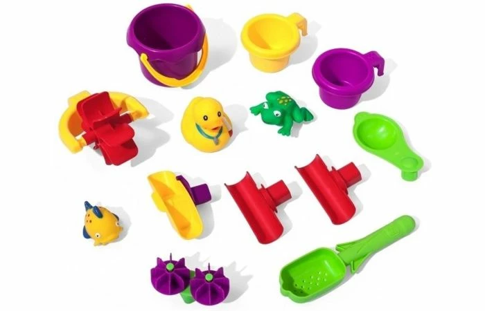- Grote emmer (inclusief) laat kinderen water uit de vijver in het watervalplateau scheppen.