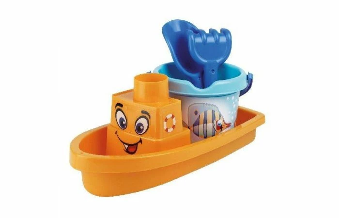 De Androni Crazy Fish speelgoed boot heeft een lengte van 33 cm. De boot is tevens voorzien van een Crazy Fish speelgoed emmer met hengsel (doorsnede van 13cm), een harkje en een schepje.