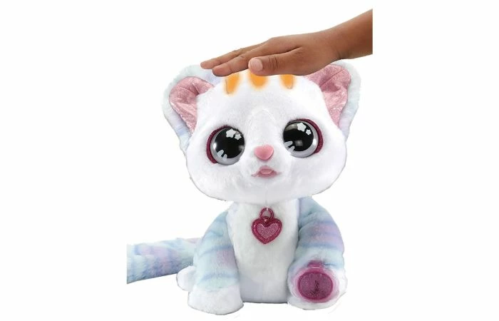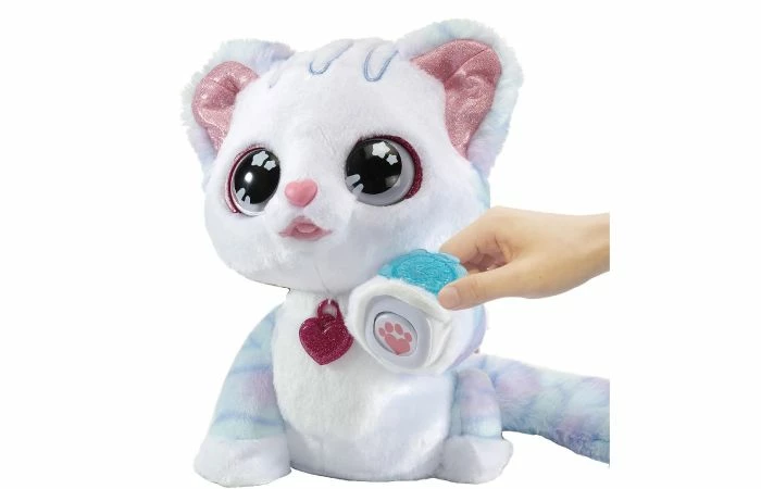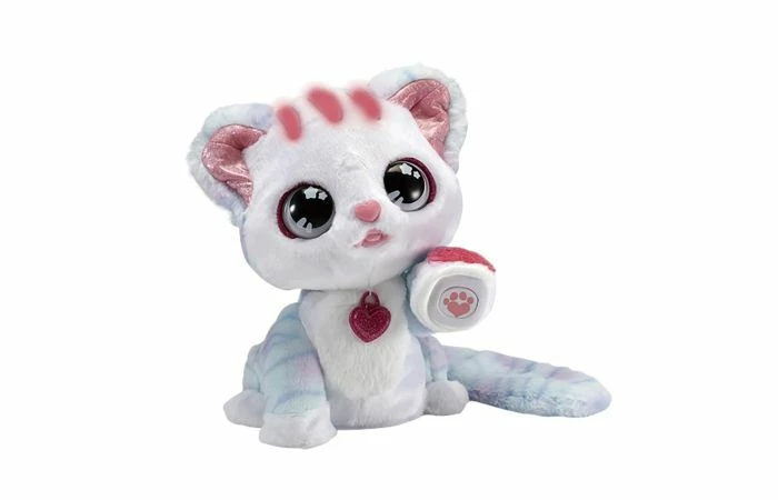 Plaats het bijgesloten inkt stempelkussen op haar pootje en druk op haar hoofd. Ruby zal je helemaal zelf een glittertattoo geven! Druk op haar buikje wanneer ze miauwt om te horen wat ze zegt. Inclusief flesje voor rollenspel en 4 interactieve toetsen: hoofd, rug, mond en buik. 11 verschillende kleurpatronen op haar hoofd geven aan hoe Ruby zich voelt. Ontdek 4 gezongen liedjes, vrolijke zinnetjes en muziek. Wordt inclusief 3 AA-batterijen geleverd in try-me verpakking. Geschikt voor kinderen vanaf 3 jaar.