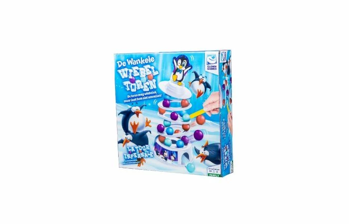 Clown Games wankele wiebeltoren. Plaats de balletjes op de basis en leg er een ring op. Zo bouw je een hoge toren. Nu ga je draaien aan de draaischijf. De kleur waarop ‘ie eindigt, geeft aan welke kleur het balletje moet hebben, dat je moet verwijderen. Dit doe je met behulp van een stokje: hiermee valt het balletje in de basis en komt hier weer uit rollen. Elk balletje dat verwijderd wordt, maakt de toren minder stabiel. De speler, die uiteindelijk de toren laat vallen, heeft verloren! Geschikt voor 2 spelers vanaf 5 jaar.